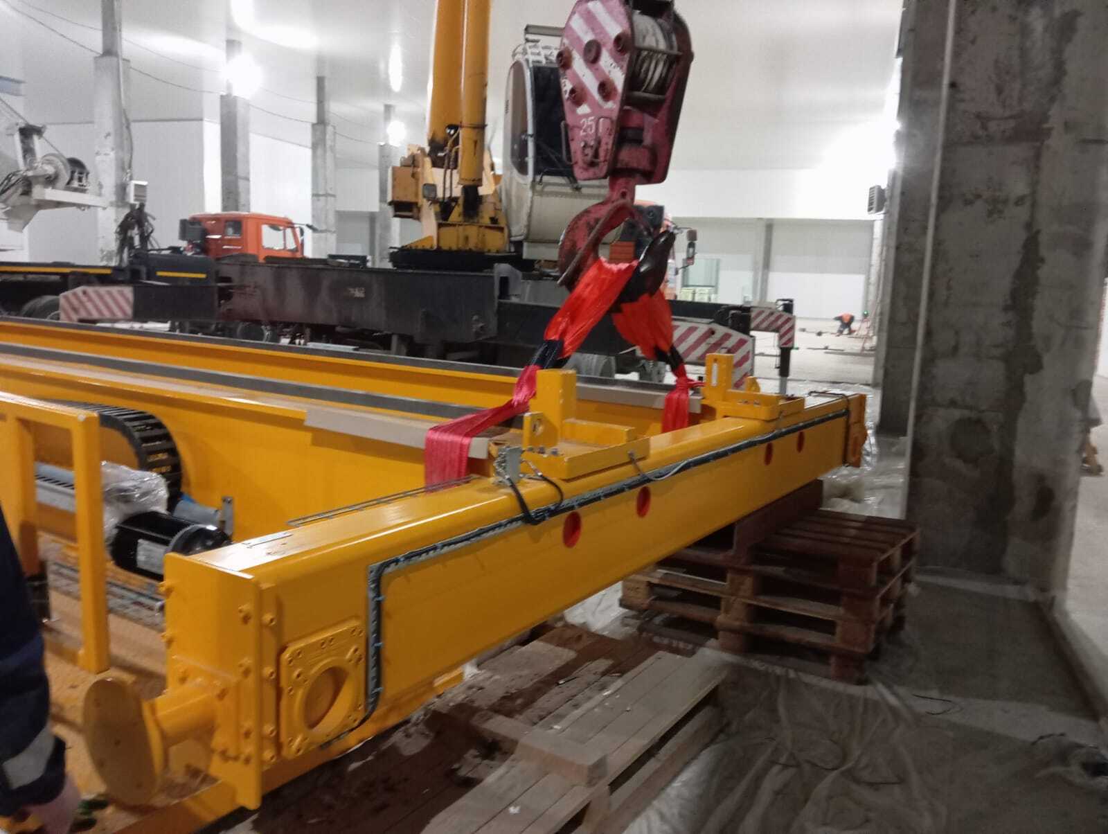 Кран Danish Crane Building доставили в комплекте, приняли по акту с проверкой узлов. Сборка началась с концевых тележек: установили на рельсы, отцентровали по вертикали. Двухбалочный мост собрали из готовых секций, соединив болтами высокого класса прочности, затем подвесили подъемный механизм по центру пролета. Настройка 23-метрового пролета учла габариты цеха и зоны доступа персонала. Троллейный шинопровод 29 метров проложили параллельно рельсам: сегменты зафиксировали кронштейнами, подключили к вводному электрошкафу крана. Питающий кабель 380В подвели строго по техническому заданию, с заземлением и защитой от перегрузок.